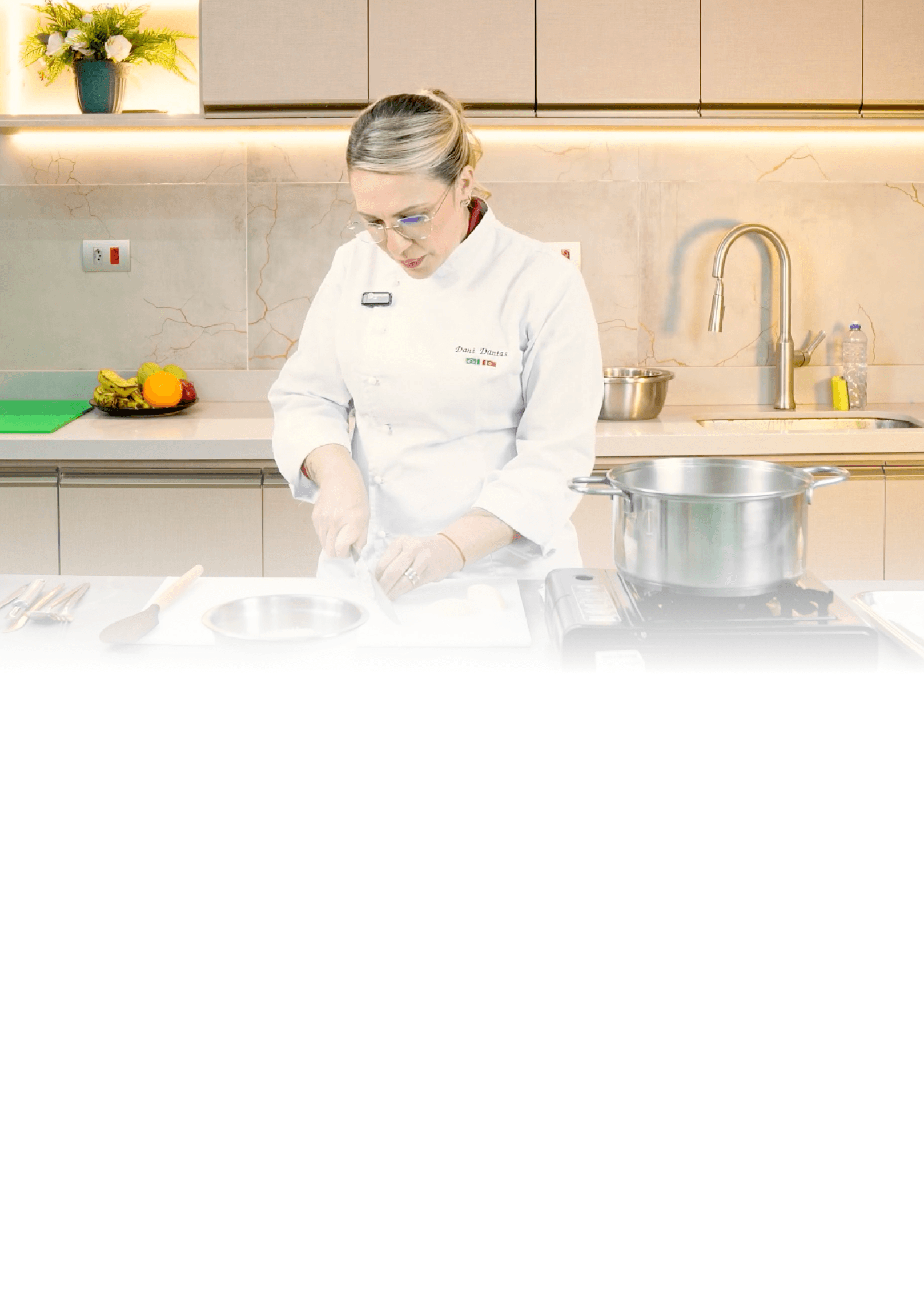 Duas vezes por mês, você me tem dentro da sua cozinha. Tirando dúvidas, ensinando técnicas na prática e até preparando as receitas que nós escolhermos juntas.